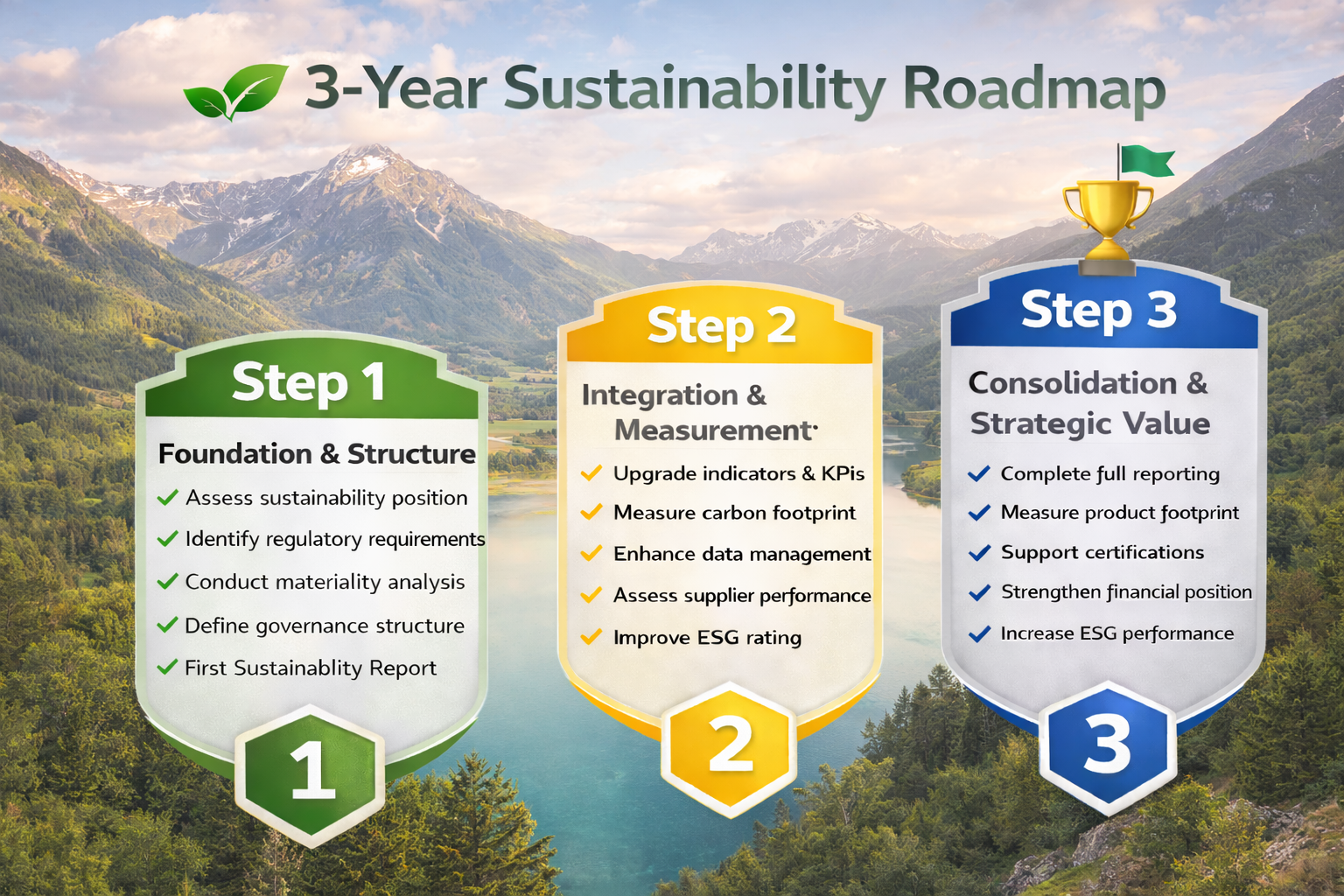 We suggest a simple 3-year plan to help your company build, improve, and fully manage sustainability step by step. From understanding the rules to becoming independent and competitive — we guide the entire journey.